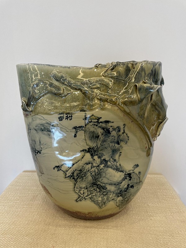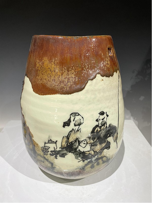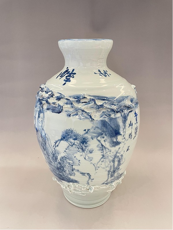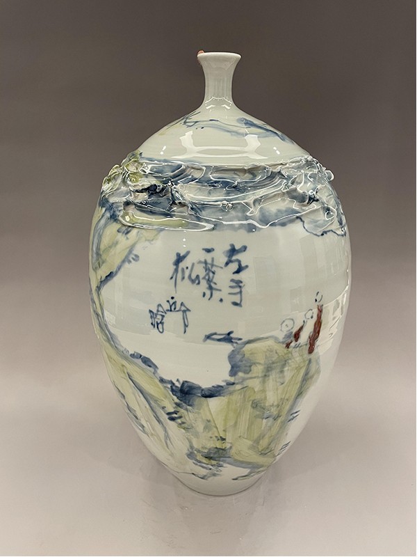深諳傳統(tǒng)技法、綜合能力強,全面掌握粉彩、青花、墨彩、新彩、釉里紅、高溫顏色釉等技藝,注重傳承與創(chuàng)新,深入研究陶瓷山水和人物,在民窯研究和日用瓷設(shè)計研發(fā)上頗具成就,創(chuàng)作不拘一格,講求稚趣、追求拙味、喜歡出新、力求變化。